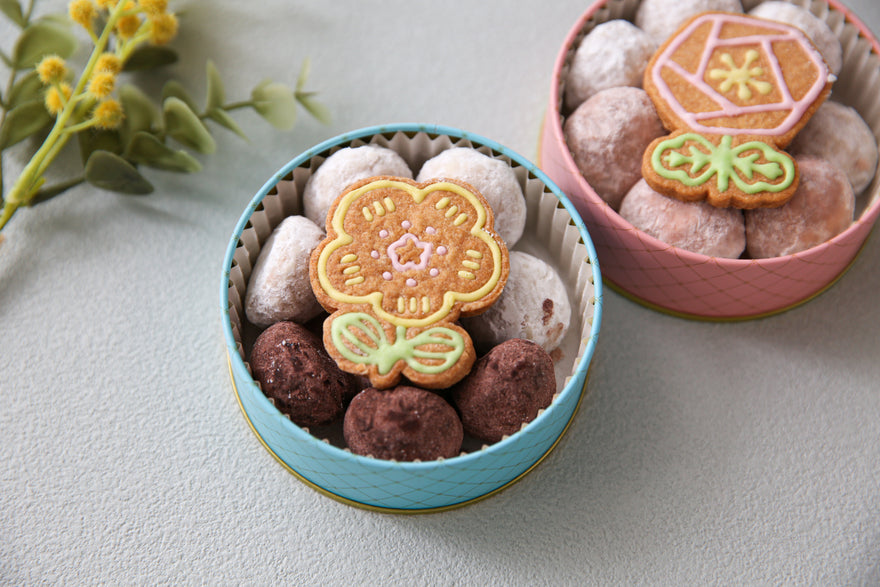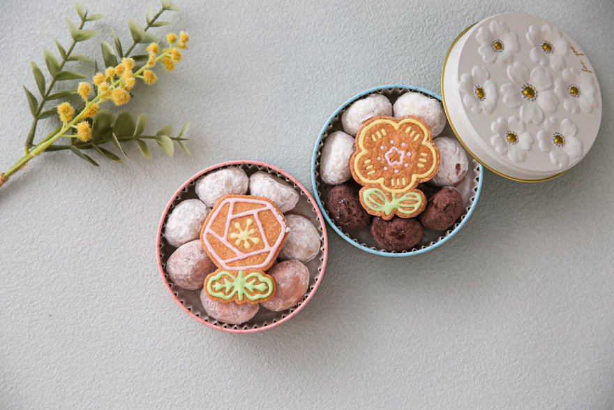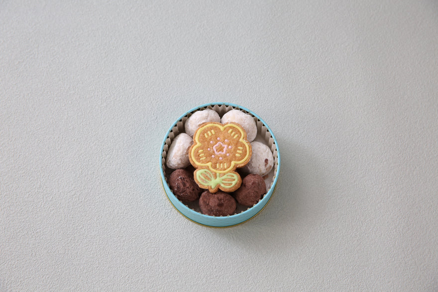 可愛らしいお花の缶に、スノーボールクッキーとお花型のアイシングクッキーを詰め込みました。缶のカラーは選べる2色展開をご用意。