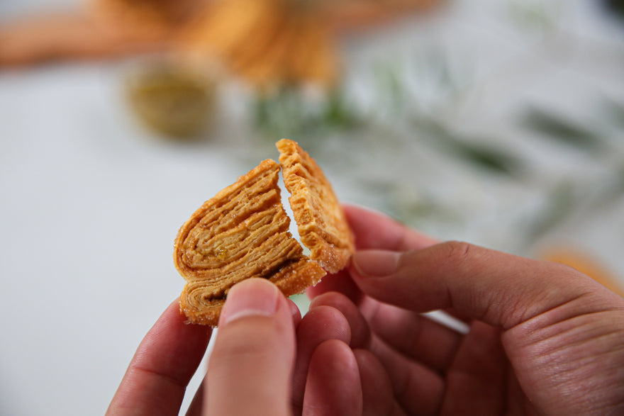 オリーブジャムと芳醇なバターを使用したサックリ食感のミニパイ。職人が手作業で織りなすパイ生地はかるい食感と香ばしい風味を生み出します。瀬戸内の穏やかな風景を彷彿とさせる讃岐土産です。