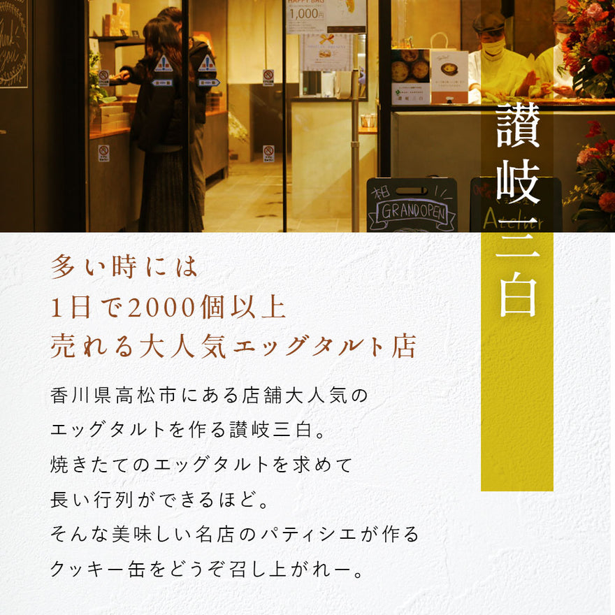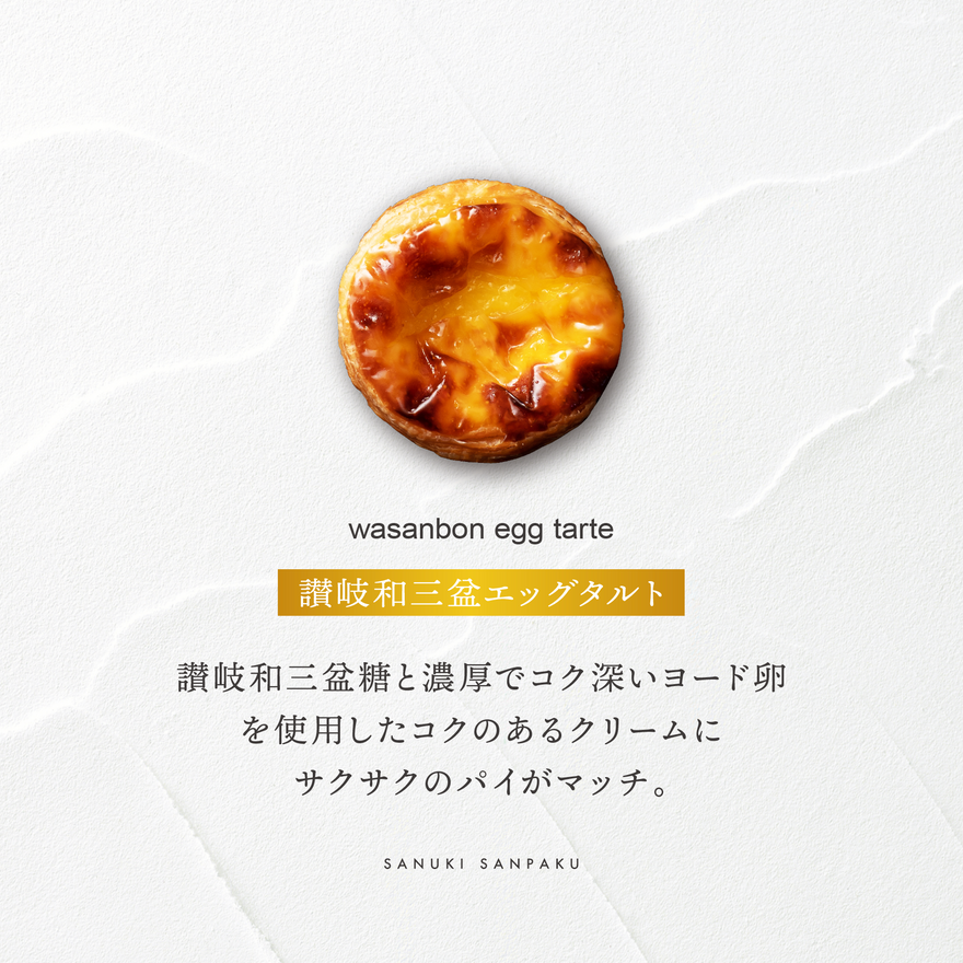 讃岐への想いが詰まった看板メニュー。タルト部分は讃岐三白ならではの独自のパイ生地となっており、手作業だからこそ生みだせるサクサク・パリパリの軽い食感と香川の県産品・讃岐和三盆糖を使用したほどけるような上品な味わいのアパレイユ(たまごクリーム)がとろっと口いっぱいに広がります。讃岐への想いがギュッと詰まった珠玉の一粒を御楽しみ下さい。